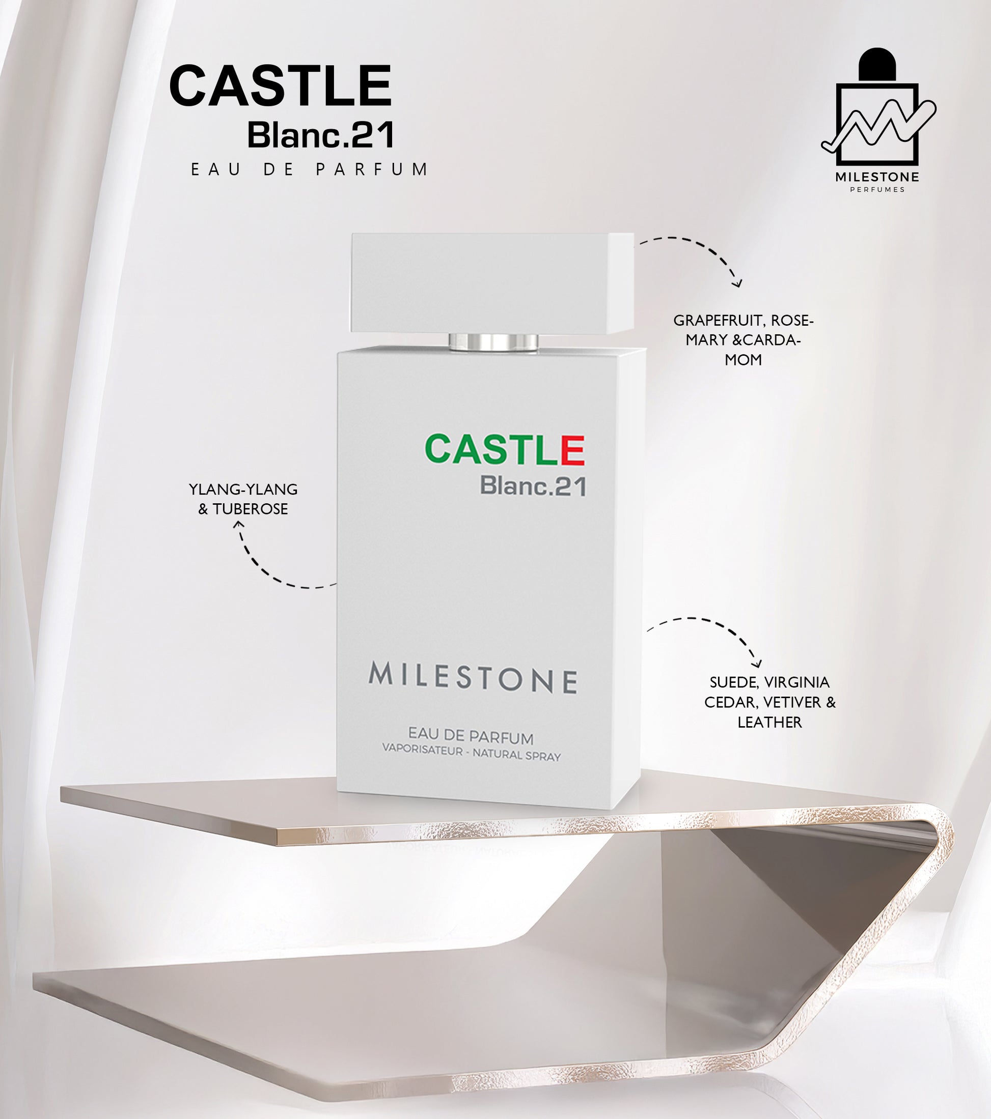 Grapefruit, Rosemary, Cardamom, Ylang-Ylang, Tuberose, Suede, Virginia Cedar, Vetiver, Leather